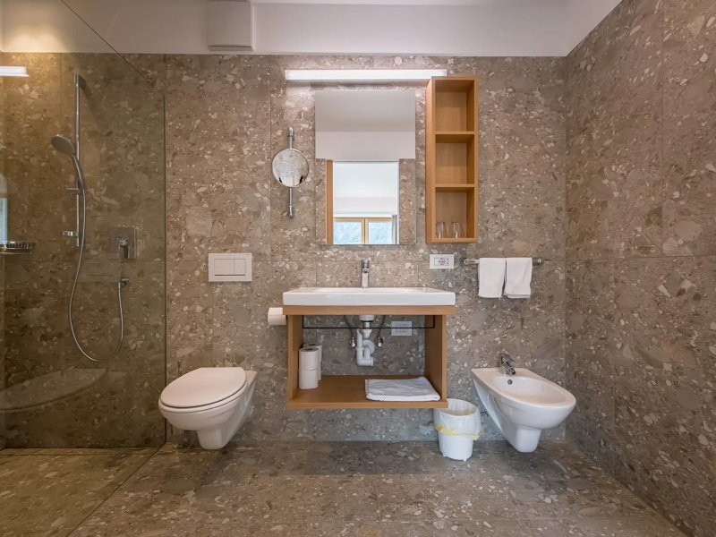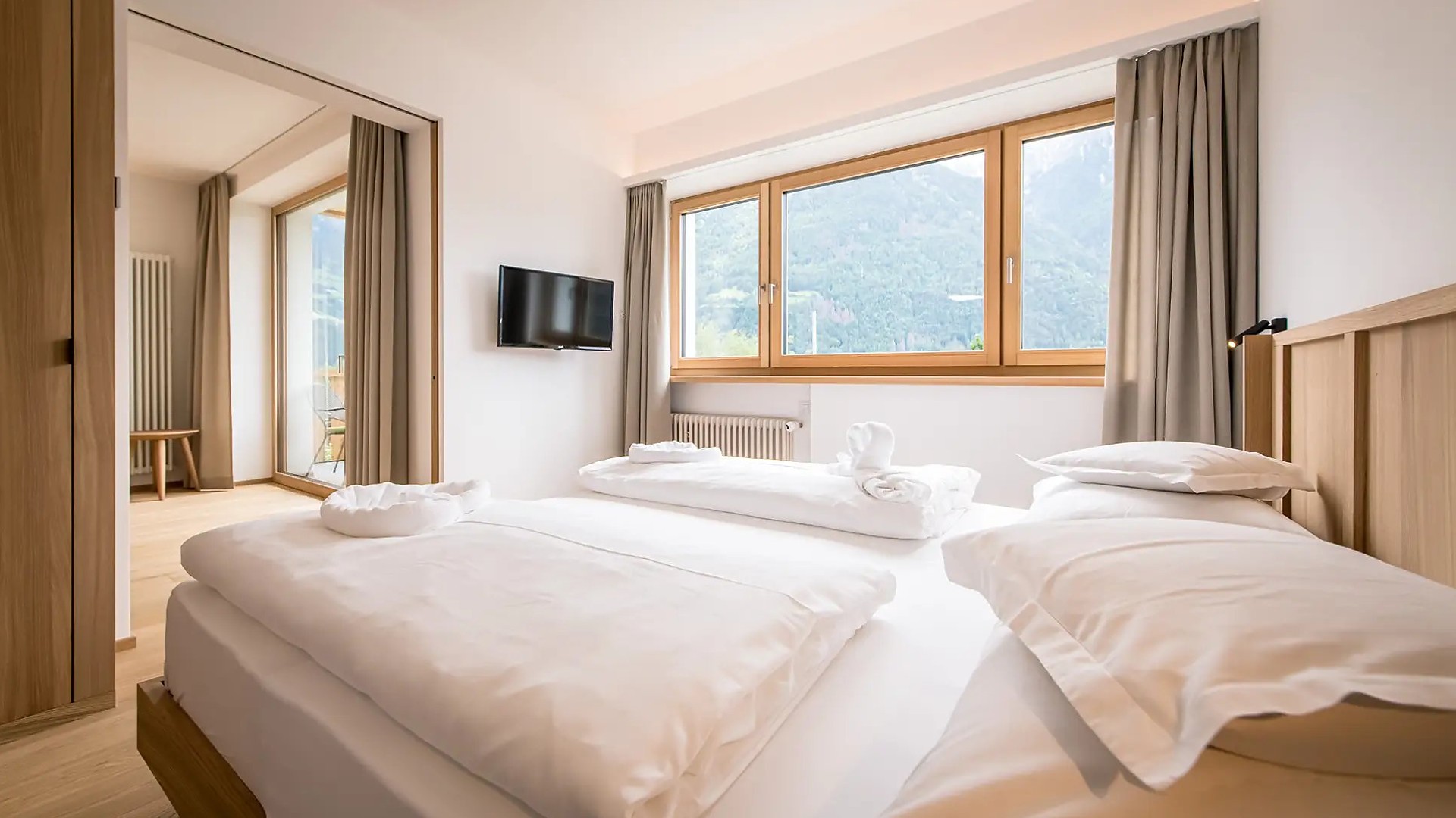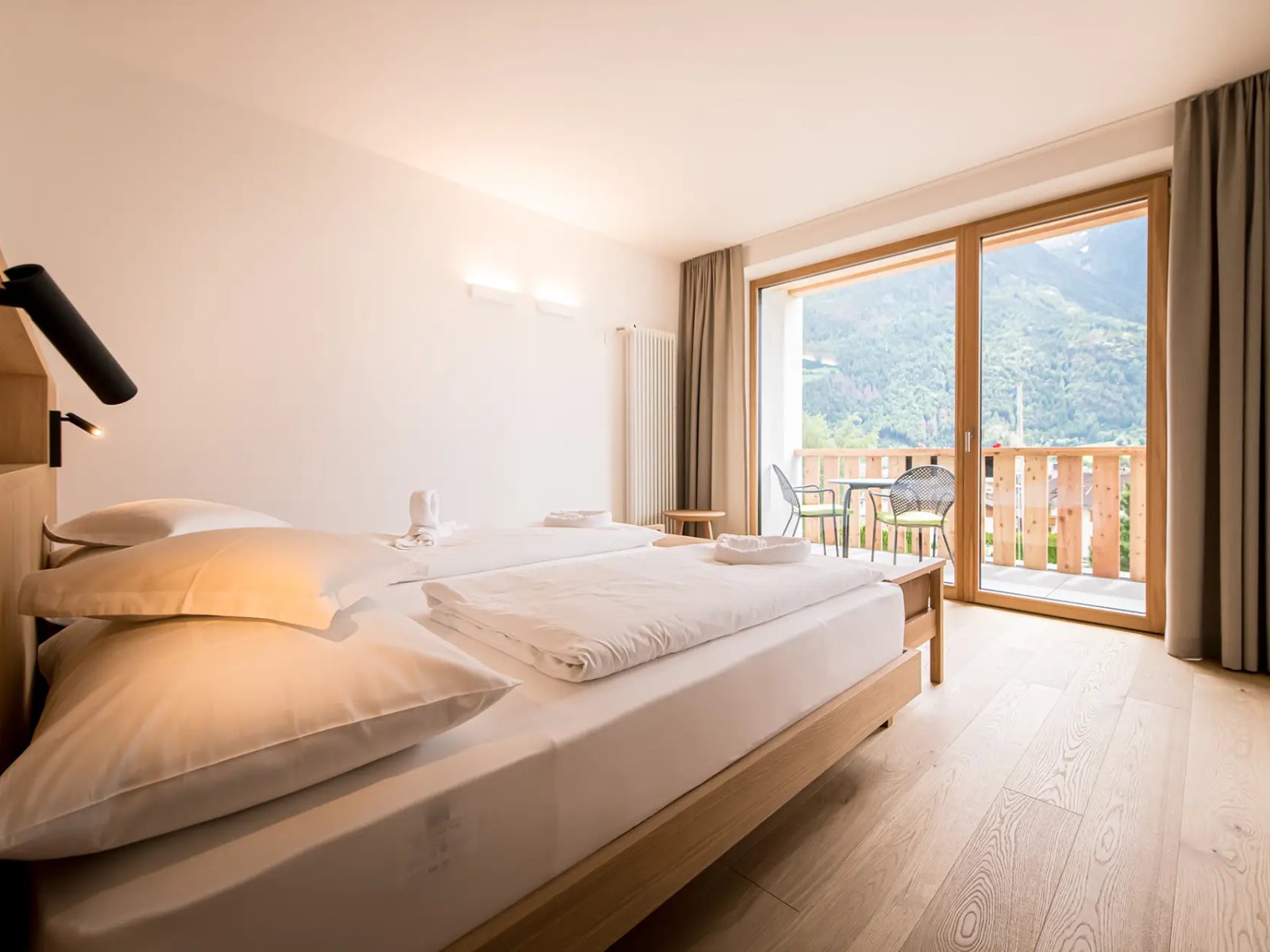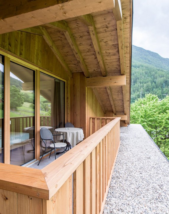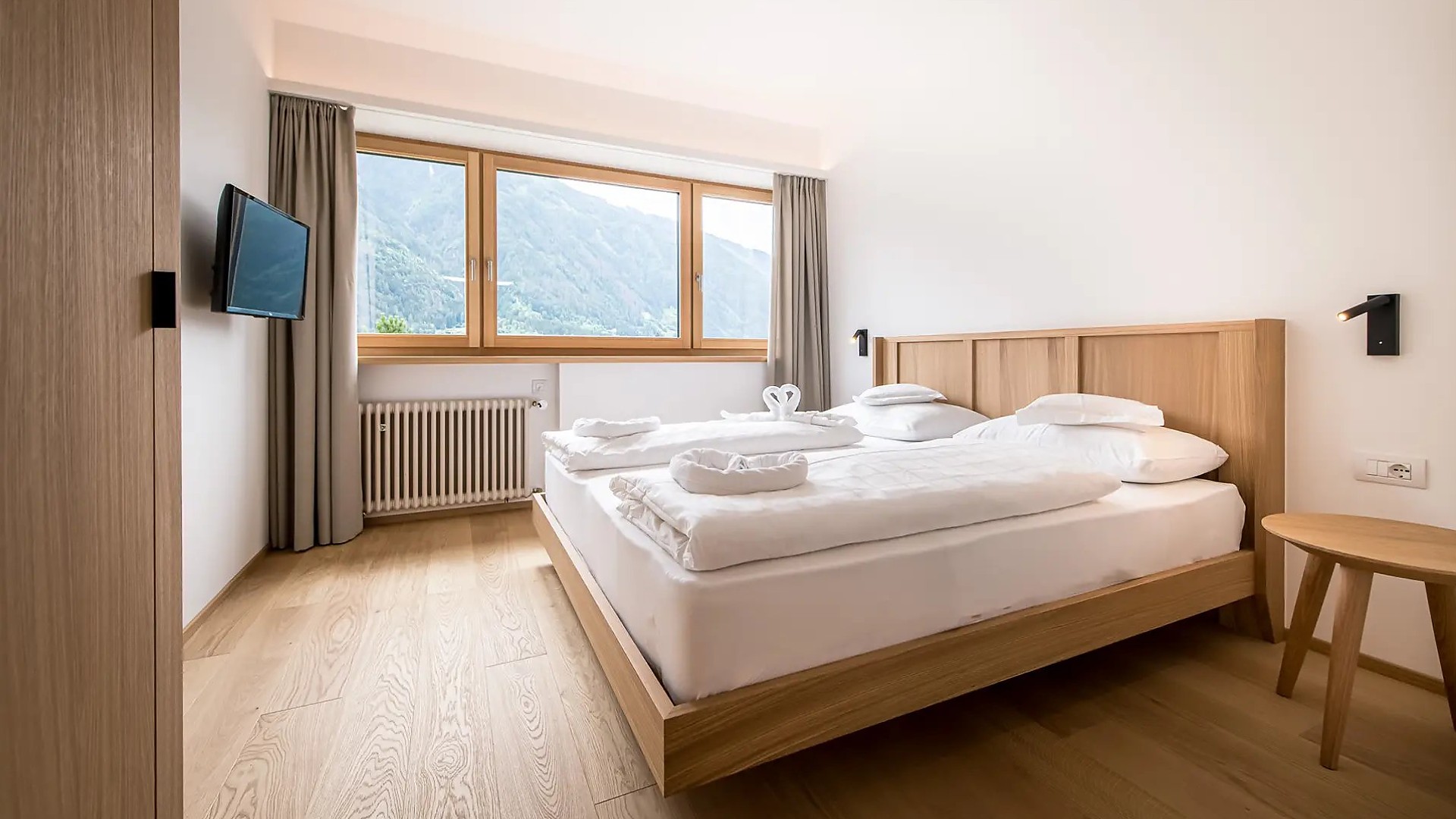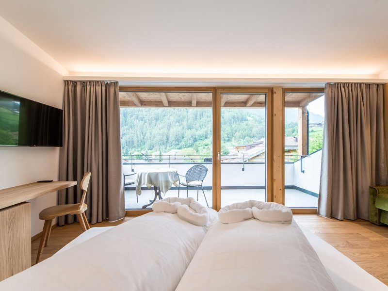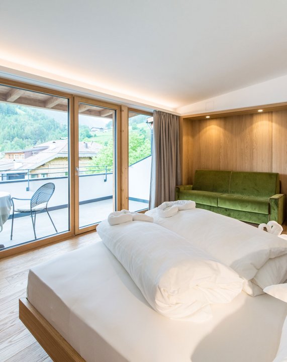 Neue ca. 30 m² große Zimmer mit atemberaubenden Ausblick auf die Ahrntaler Bergwelt. Doppelbett, große Terrasse mit Sitzecke, Holzboden, Kleiderschrank, Bad mit Dusche, WC, Bidet und Fön, großer TV, Safe, WLAN und ausziehbare Couch, ideal für 2–4 Personen. Zimmer im 3. Obergeschoss nur erreichbar über Treppen (Aufzug bis zum 2. Stock).