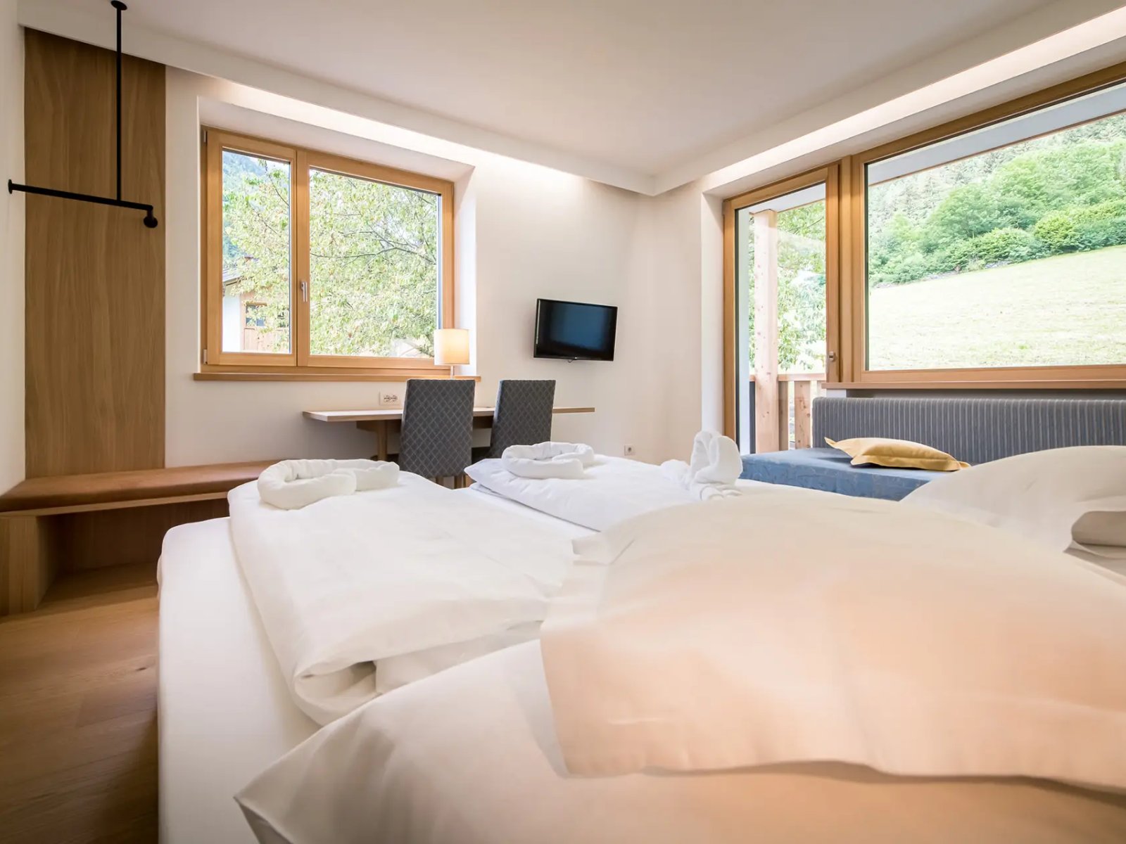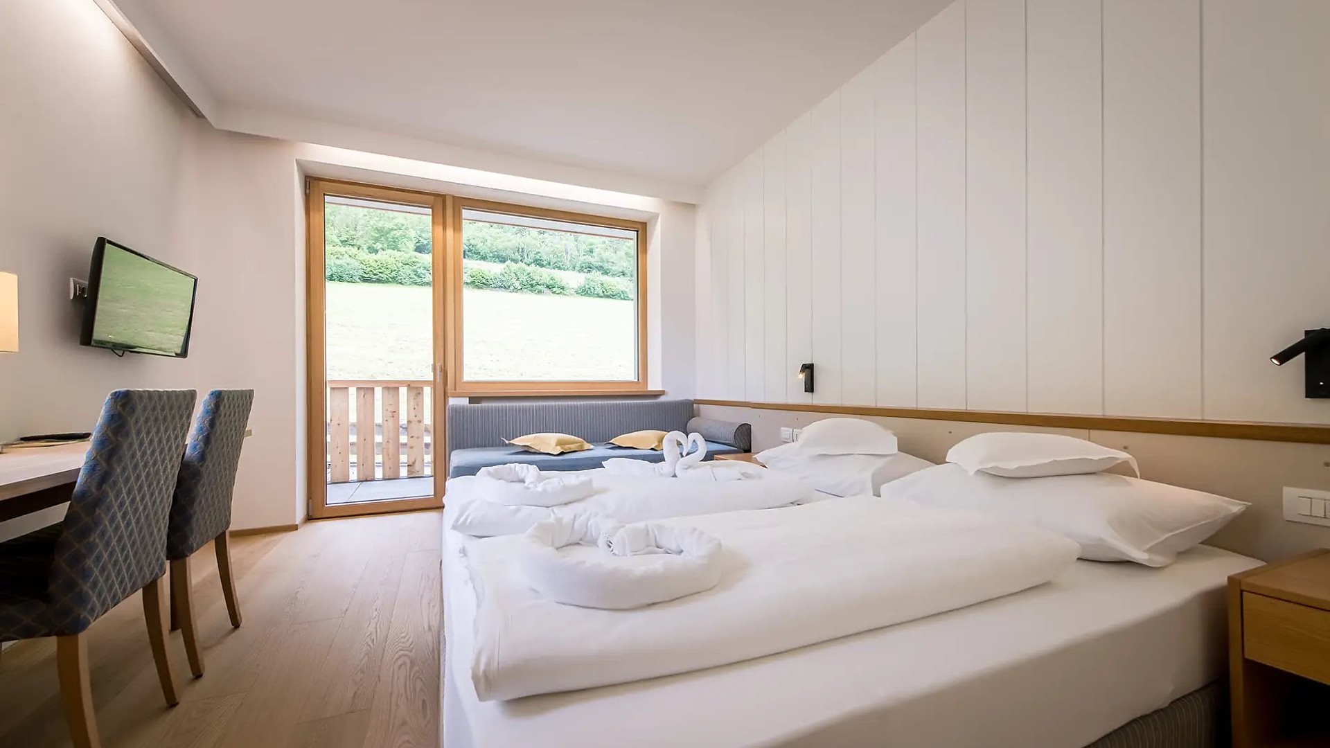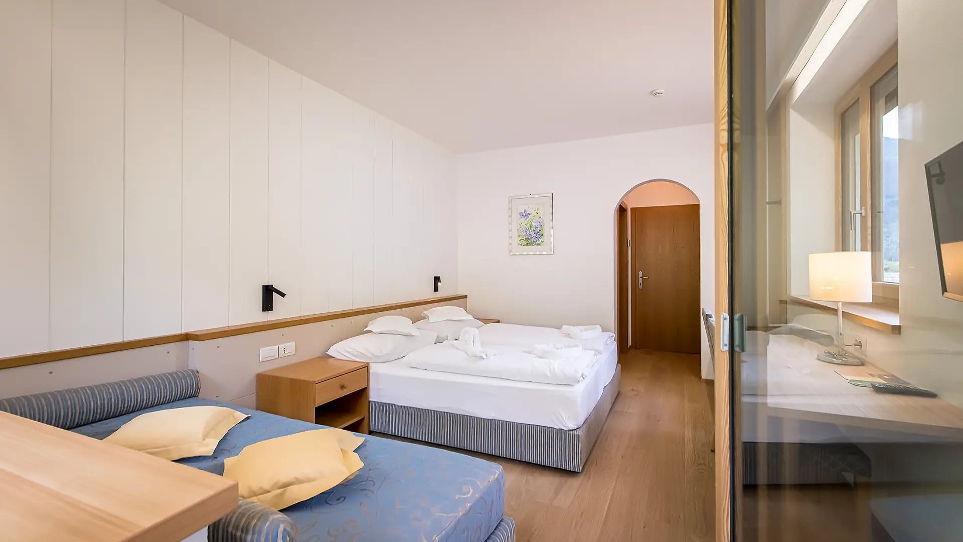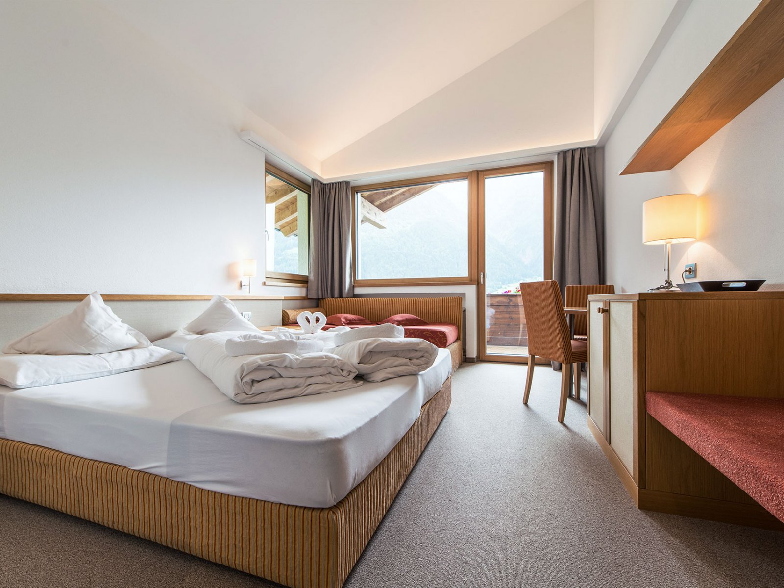 Neu renovierte Zimmer, ca. 25 m² groß, mit größeren Fenstern für einen noch besseren Ausblick, Doppelbett, Balkon, Badezimmer mit Dusche, WC und Fön, TV, Telefon, Safe, WLAN und Couch, die als drittes Bett genutzt werden kann, ideal für 2–3 Personen. Alle Zimmer sind mit dem Lift erreichbar.