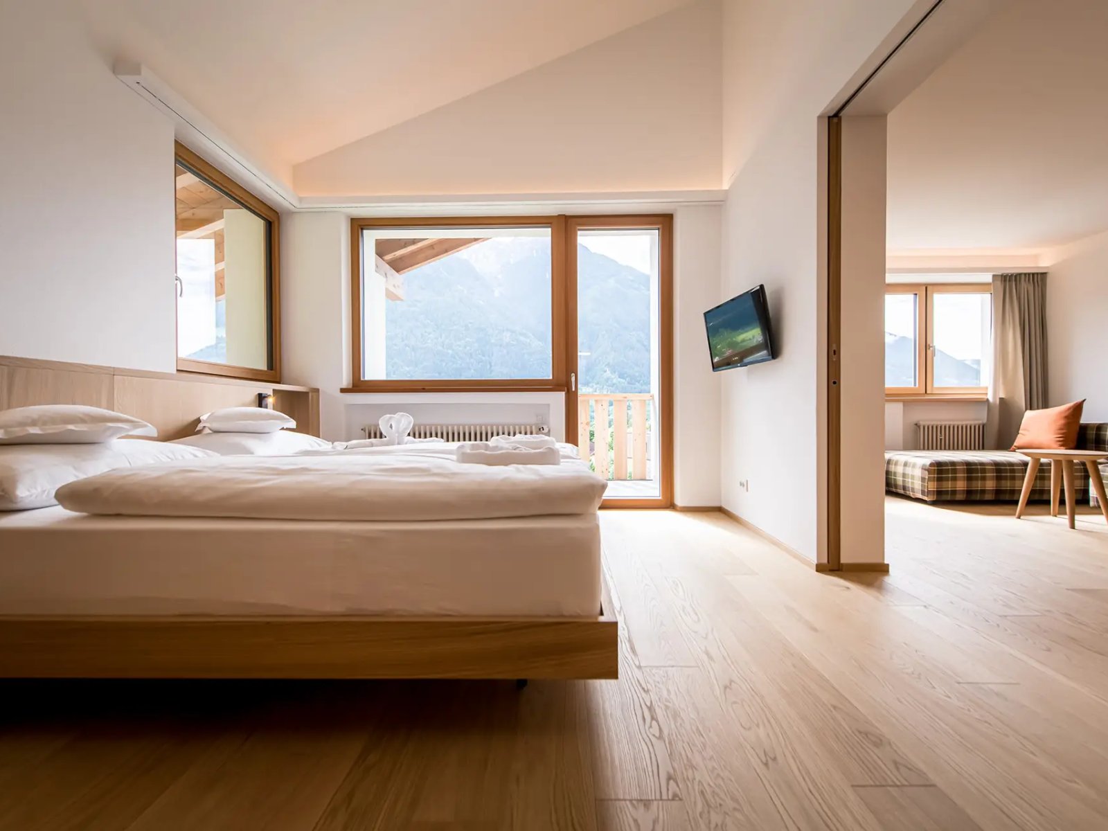 Suite mit ca. 50 m² im zweiten Obergeschoss für 2 – 4 Personen mit Balkon, Schlafzimmer und separatem Wohnbereich, Badezimmer mit Dusche, Bidet, WC sowie ein zusätzliches Tages-WC.