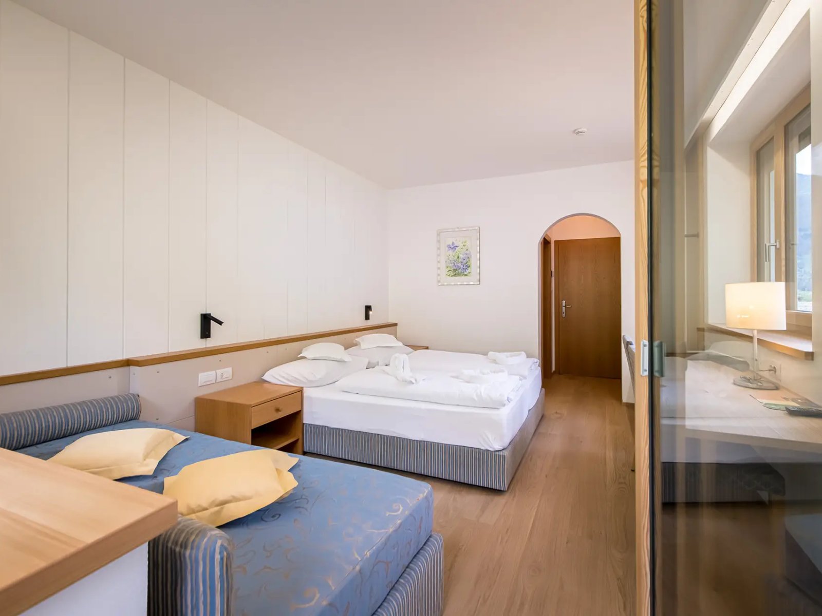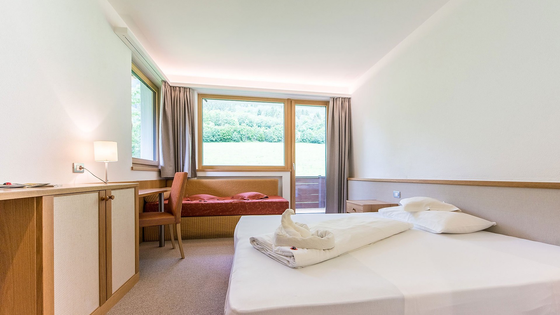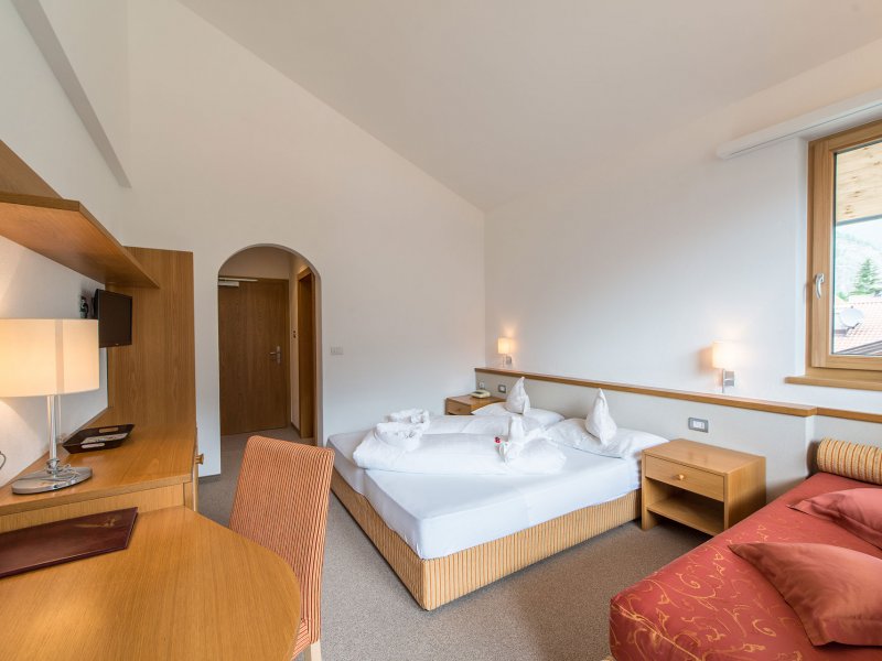 Newly renovated rooms, approx. 25 m² in size, with larger windows for an even better view, double bed, balcony, bathroom with shower, toilet and hairdryer, TV, telephone, safe, WiFi and couch that can be used as a third bed ideal for 2–3 people. All rooms can be reached by elevator.