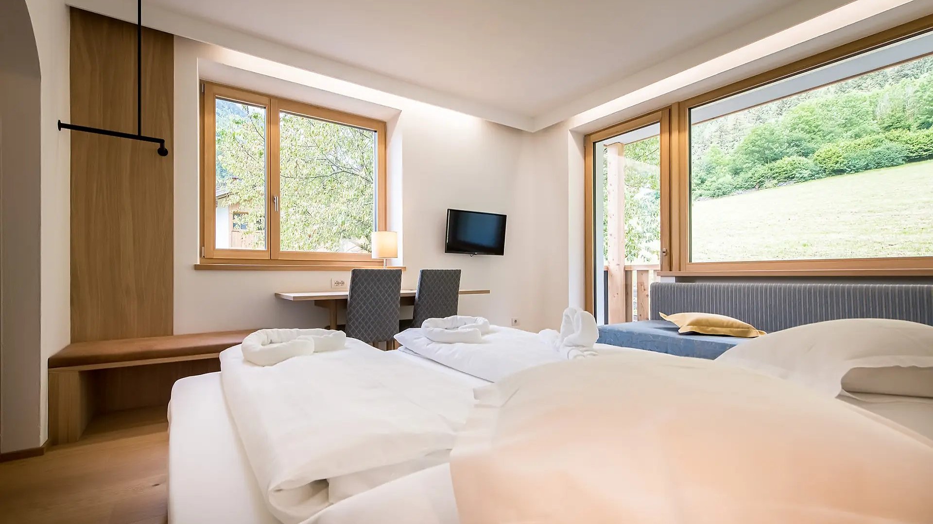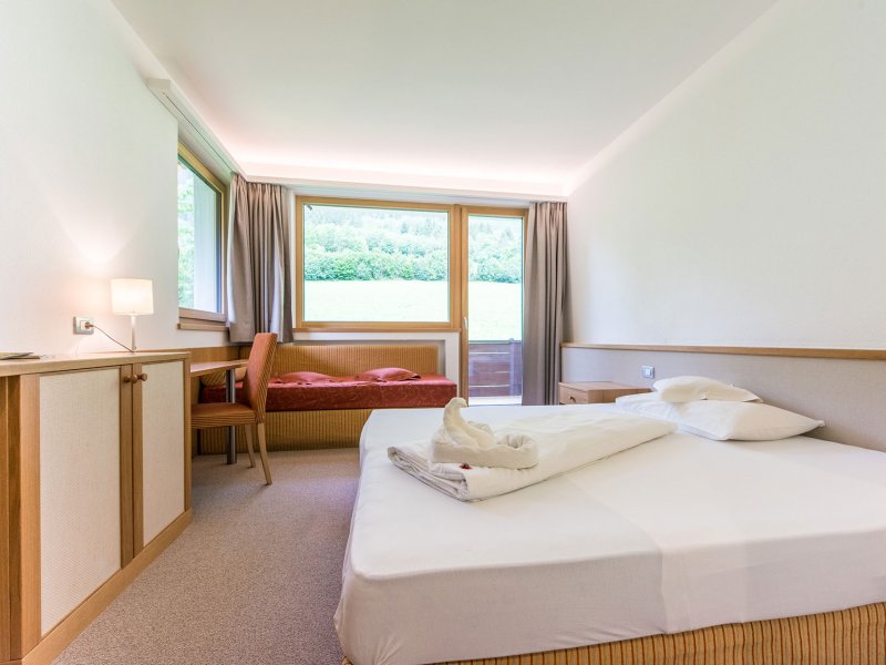 Camera recentemente rinnovata, circa 25 m², con ampie finestre per vista panoramica, letto matrimoniale con divano letto che può essere utilizzato come terzo letto, ideale per 2-3 persone, balcone, bagno con doccia, WC e asciugacapelli, TV, telefono, cassaforte, Wi-fi. Tutte le camere sono accessibili tramite ascensore.
