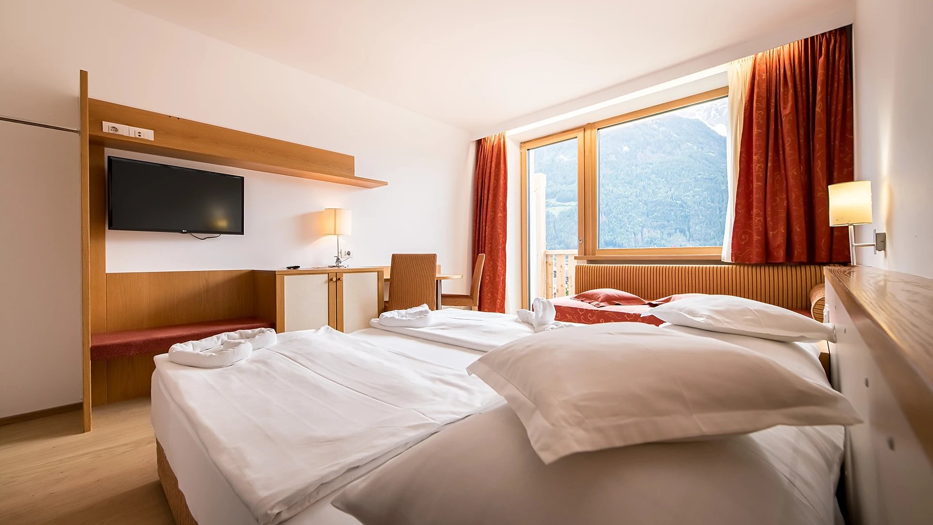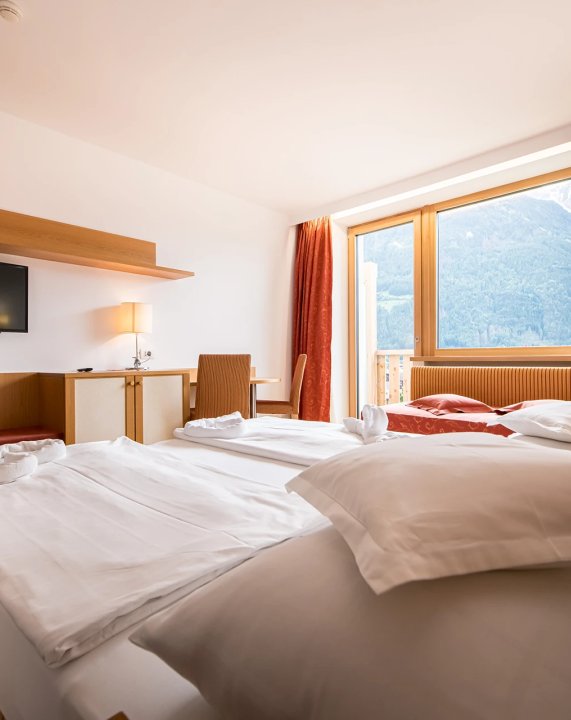 Camera confortevole al 1° e 2° piano, circa 25 m², letto matrimoniale con un divano letto che può essere utilizzato come terzo letto, ideale per 2-3 persone, balcone con vista sulle montagne, bagno con doccia, WC, bidet e asciugacapelli, TV, telefono, cassaforte, Wi-Fi. Tutte le stanze sono accessibili tramite ascensore.