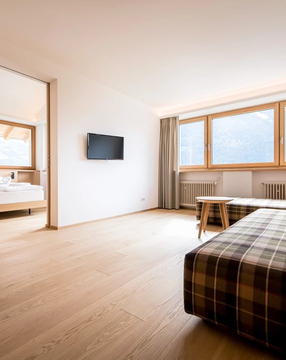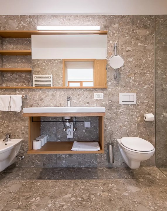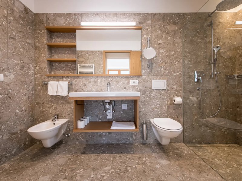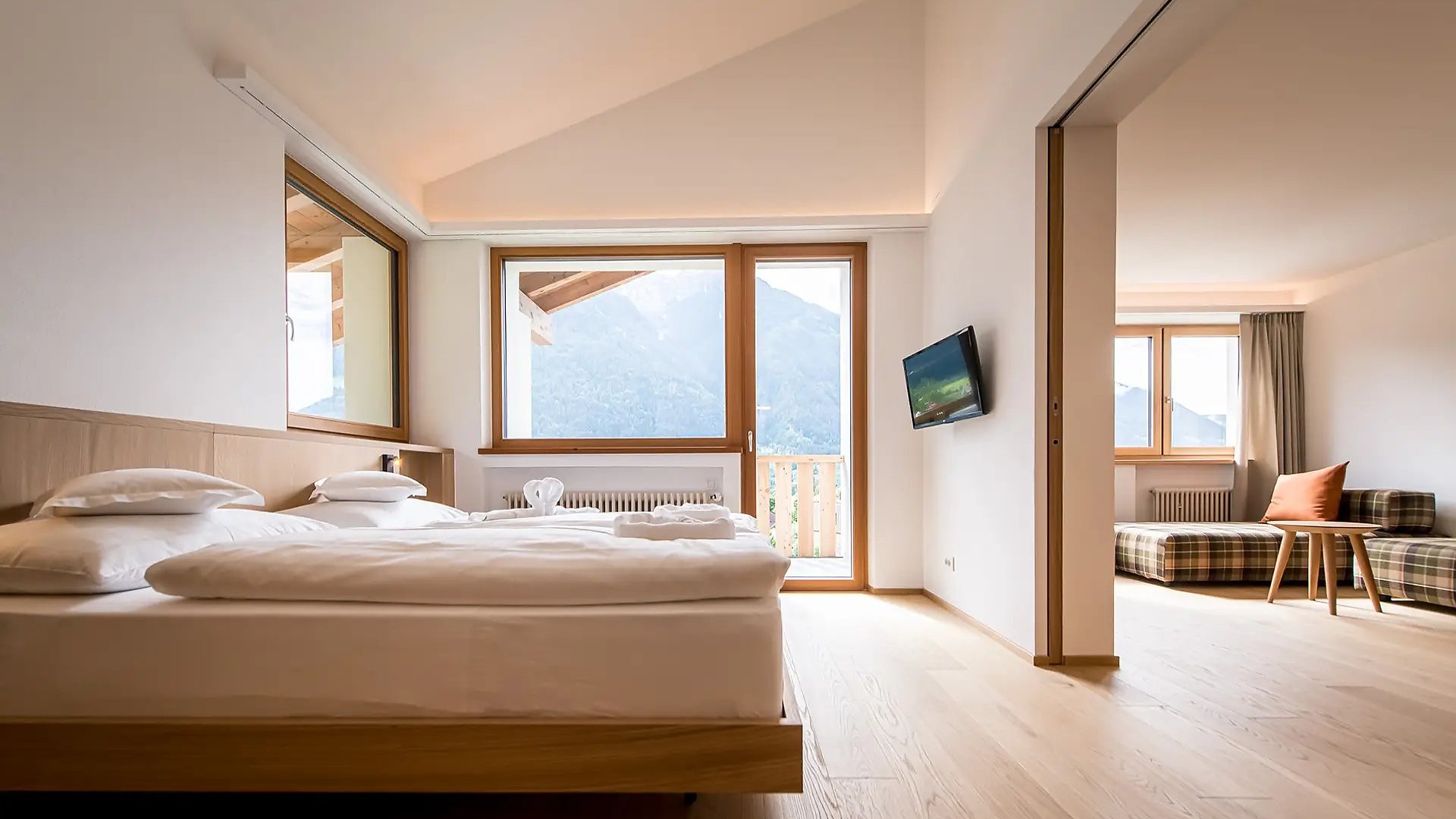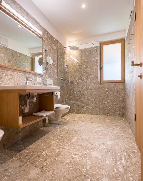 Suite ca. 50 m² nel secondo piano per 2 – 4 persone con balcone, stanza matrimoniale e soggiorno, bagno con doccia, bidet, toilette e una toilette diurna.